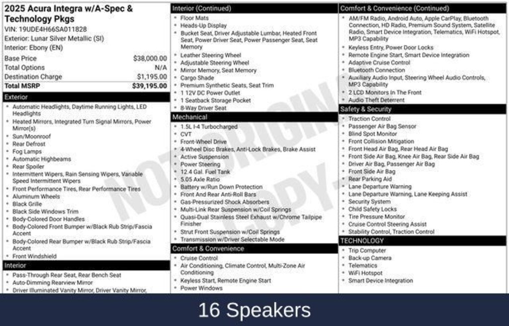 2025 Acura Integra A-Spec Tech Package 16 Speakers, 18" Aluminum Alloy Wheels, Adaptive suspension, Alloy wheels, AM/FM radio: SiriusXM, Apple CarPlay/Android Auto, Auto High-beam Headlights, Automatic temperature control, Emergency communication system: AcuraLink (subscription required), Front fog lights, Fully automatic headlights, Heads-Up Display, Heated door mirrors, Heated Front Bucket Seats, Heated front seats, Illuminated entry, Lane departure: Lane Keeping Assist System (LKAS) active, Leather Shift Knob, Leather steering wheel, Microsuede-Trimmed Front Seats with Exclusive Stitch, Panic alarm, Power moonroof, Radio data system, Radio: ELS Studio 3D Premium Audio System, Rain sensing wipers, Remote keyless entry, Security system, Steering wheel mounted audio controls.