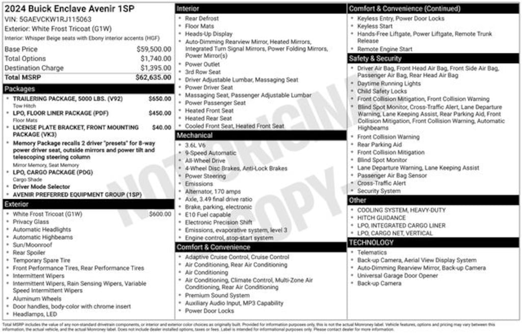 2024 Buick Enclave Avenir AWD, 10 Speakers, 5,000 lbs Trailering Package, Alloy wheels, Auto High-beam Headlights, Automatic temperature control, Bose Performance-Enhanced 10-Speaker System, Emergency communication system: OnStar and Buick connected services capable, Exterior Parking Camera Rear, Fully automatic headlights, Garage door transmitter, Heads-Up Display, Heated door mirrors, Heated Driver & Front Passenger Seats, Heated front seats, Heated rear seats, Heated steering wheel, Heavy-Duty Cooling System, Hitch Guidance, Hitch Guidance w/Hitch View, Illuminated entry, Integrated Cargo Liner (LPO), Leather steering wheel, Memory seat, Navigation System, Panic alarm, Perforated Leather-Appointed Seat Trim, Power Liftgate, Power moonroof, Preferred Equipment Group 1SP, Premium audio system: Buick Infotainment System, Radio: Buick Infotainment Sys AM/FM Stereo w/Nav, Rain sensing wipers, Remote keyless entry, Security system, SiriusXM w/360L, Steering wheel memory, Steering wheel mounted audio controls, Vehicle Health Management, Ventilated Driver & Front Passenger Seats, Ventilated front seats, Wheels: 20" w/Pearl Nickel Finish, Wireless Apple CarPlay/Wireless Android Auto.
