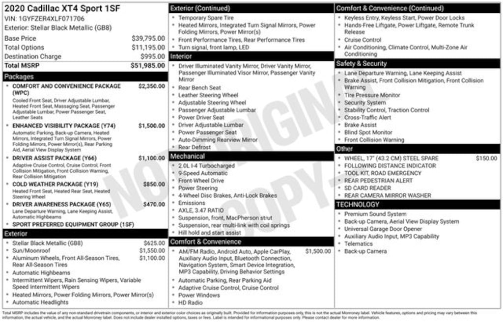 2020 Cadillac XT4 Sport 20" Twin 5-Spoke Alloy Wheels, 4.2" Diagonal Color Display Driver Info Center, 6-Way Power Passenger Seat Adjuster, 7 Speakers, 8-Way Power Passenger Seat Adjuster, Advanced Adaptive Cruise Control, Alloy wheels, Auto-Dimming Inside Rear-View Mirror, Automatic Emergency Braking, Automatic Parking Assist w/Braking, Automatic temperature control, Body-Color Heated Power-Adjustable Outside Mirrors, Bose Centerpoint Surround Sound 13-Speaker System, Cold Weather Package, Comfort & Convenience Package, Cruise Control w/Set & Resume Speed, Driver Assist Package, Driver Awareness Package, Dual Panel Glass Sunroof w/Power Tilt/Sliding, Enhanced Automatic Emergency Braking, Enhanced Visibility Package, Exterior Parking Camera Rear, Following Distance Indicator, Front & Rear Park Assist, Fully automatic headlights, HD Rear Vision Camera, HD Surround Vision, Heated Automatic Steering Wheel, Heated Driver & Front Passenger Seats, Heated Outside Mirrors w/Integrated Turn Signal, Heated Rear Outboard Seating Positions, IntelliBeam Automatic High Beam Control, Lane Keep Assist w/Lane Departure Warning, Manual Rake & Telescopic Steering Column, Navigation System, Panic alarm, Power Liftgate, Power Lumbar Massage Driver Seat, Power Lumbar Massage Front Passenger Seat, Preferred Equipment Group 1SF, Radio: Cadillac User Experience w/Embedded Nav, Rain sensing wipers, Rear Camera Mirror, Rear Camera Mirror Washer, Rear Pedestrian Alert, Remote keyless entry, Reverse Automatic Braking, Security system, Steering wheel mounted audio controls, Ventilated Driver & Front Passenger Seats.