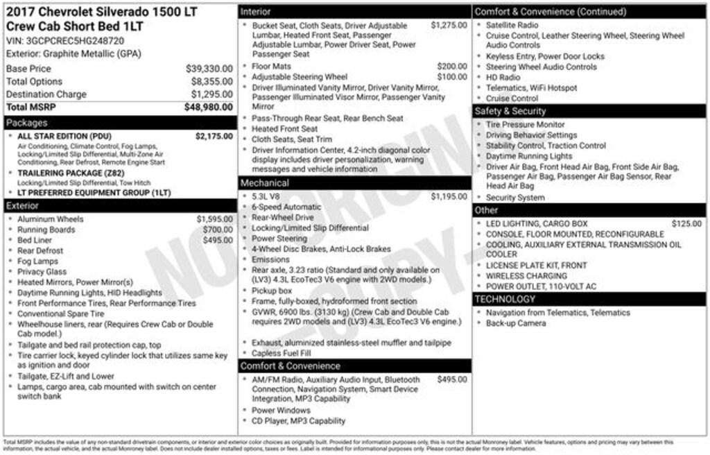 2017 Chevrolet Silverado 1500 LT LT1 6-Speed Automatic Electronic with Overdrive, Black Cloth.