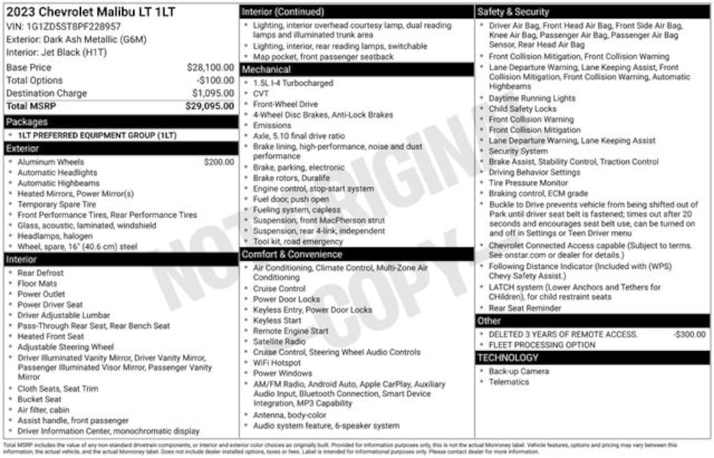 This well-equipped 2023 Chevrolet Malibu LT 1LT is available now at our dealership for the competitive price of $17,281. Experience the perfect blend of style, technology, and efficiency by scheduling a test drive today. We're confident that this Malibu will exceed your expectations and become the ideal addition to your driving lifestyle.