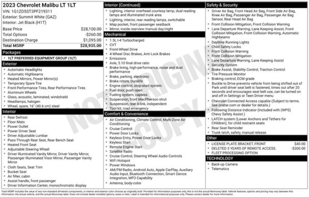 2023 Chevrolet Malibu LT 1LT Black Cloth, 17" Aluminum Wheels, 6-Speaker Audio System Feature, Alloy wheels, Apple CarPlay/Android Auto, Auto High-beam Headlights, Automatic temperature control, Emergency communication system: OnStar and Chevrolet connected services capable, Exterior Parking Camera Rear, Fully automatic headlights, Heated door mirrors, Heated Driver & Front Passenger Seats, Heated front seats, Illuminated entry, Panic alarm, Preferred Equipment Group 1LT, Premium audio system: Chevrolet Infotainment 3 Plus, Radio: Chevrolet Infotainment 3 System, Remote keyless entry, Security system, SiriusXM Radio, Steering wheel mounted audio controls, Telescoping steering wheel, Wireless Apple CarPlay/Android Auto.