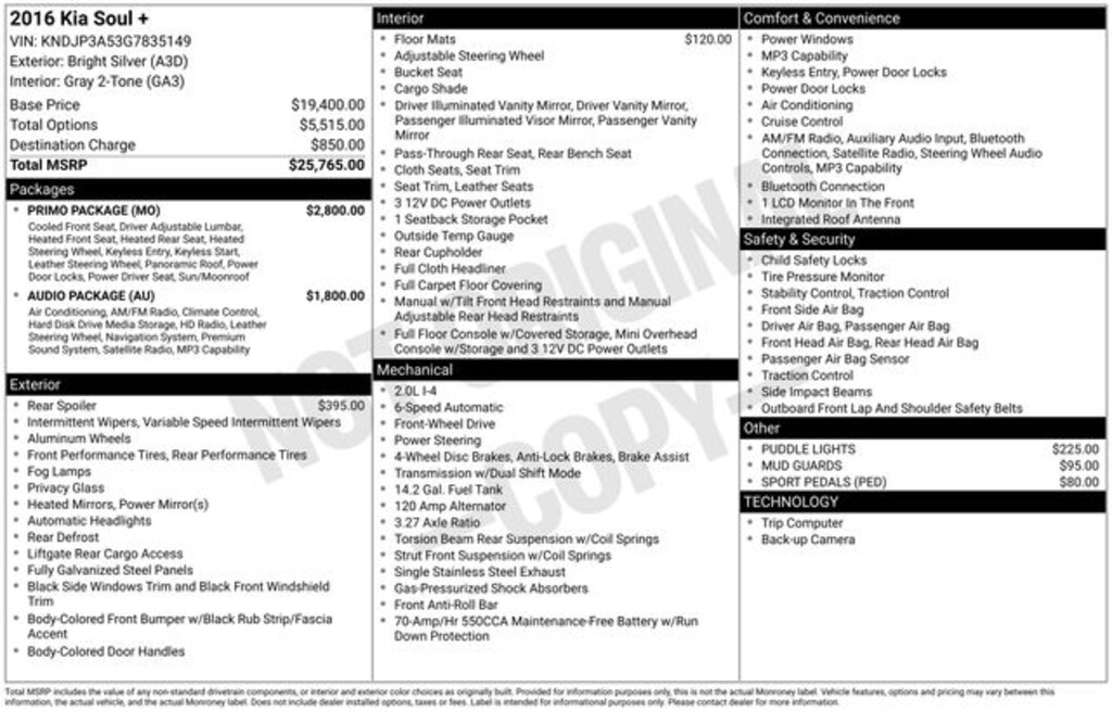 2016 Kia Soul Plus 10-Way Power Adjustable Driver's Seat, 17" x 6.5J Alloy Wheels, 6 Speakers, Alloy wheels, Audio Package, Automatic Temperature Control, Engine Immobilizer, Exterior Parking Camera Rear, Front fog lights, Fully automatic headlights, Heated & Ventilated Front Seats, Heated door mirrors, Heated Outboard Rear Seats, Heated Steering Wheel, Leather Seat Trim, Leather-Wrapped Steering Wheel & Gearshift Knob, Leatherette Instrument Hood/Door Center/Armrests, Panic alarm, Panoramic Sunroof w/Power Sunshade, Piano Black Interior Accents, Primo Package, Push Button Start, Radio: Navigation w/Infinity Audio System, Remote keyless entry, Satin Chrome Interior Door Handles, Sport Pedals (PED), Steering wheel mounted audio controls.